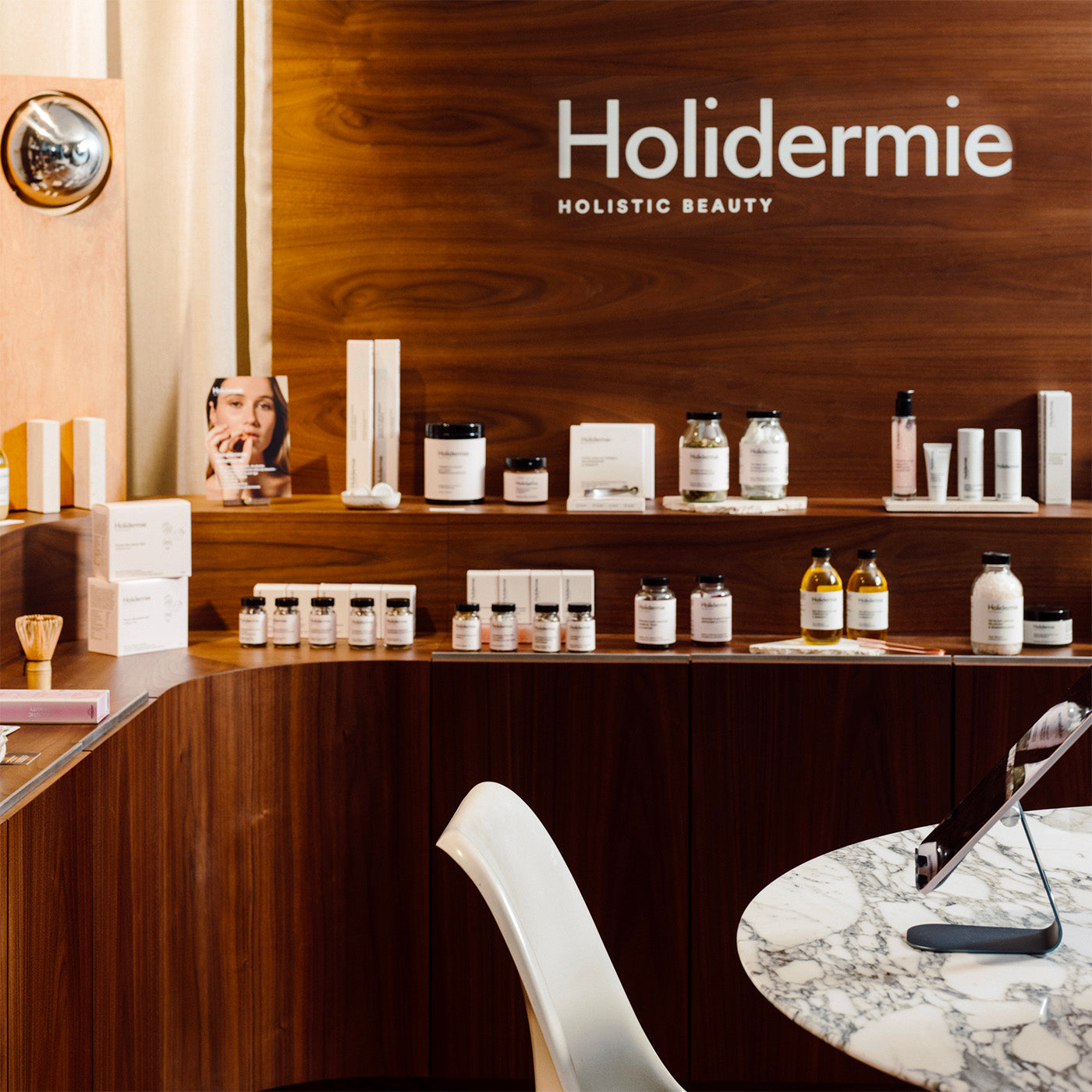 A 100 m² space that fully embodies Holidermie's vision where beauty becomes a true skincare ritual, both inside and out. Come and discover our full Inside & Out range, savor one of our virtuous beverages, and explore our exclusive protocols as well as innovative technologies to sublimate your skin: skin diagnosis assisted by artificial intelligence, LED session at the Flash Bar... and more.