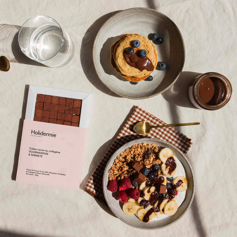 The Collagen & Chocolate Cream: The fusion of Carrés Sauvages, experts in raw and organic chocolates made in France, and Holidermie, pioneers in holistic skincare, has resulted in an exceptional collagen-enriched spread. This unique creation combines the elegance of high-end chocolate with the benefits of collagen, offering a refined tasting experience that nourishes and enhances your skin in a single step.