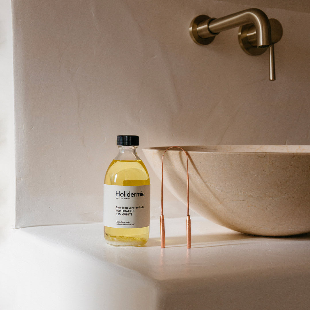 This duo consists of Copper Tongue Scraper with antiseptic properties and the Mouthwash-in-oil Holidermie, 100% ORGANIC and Made in France.