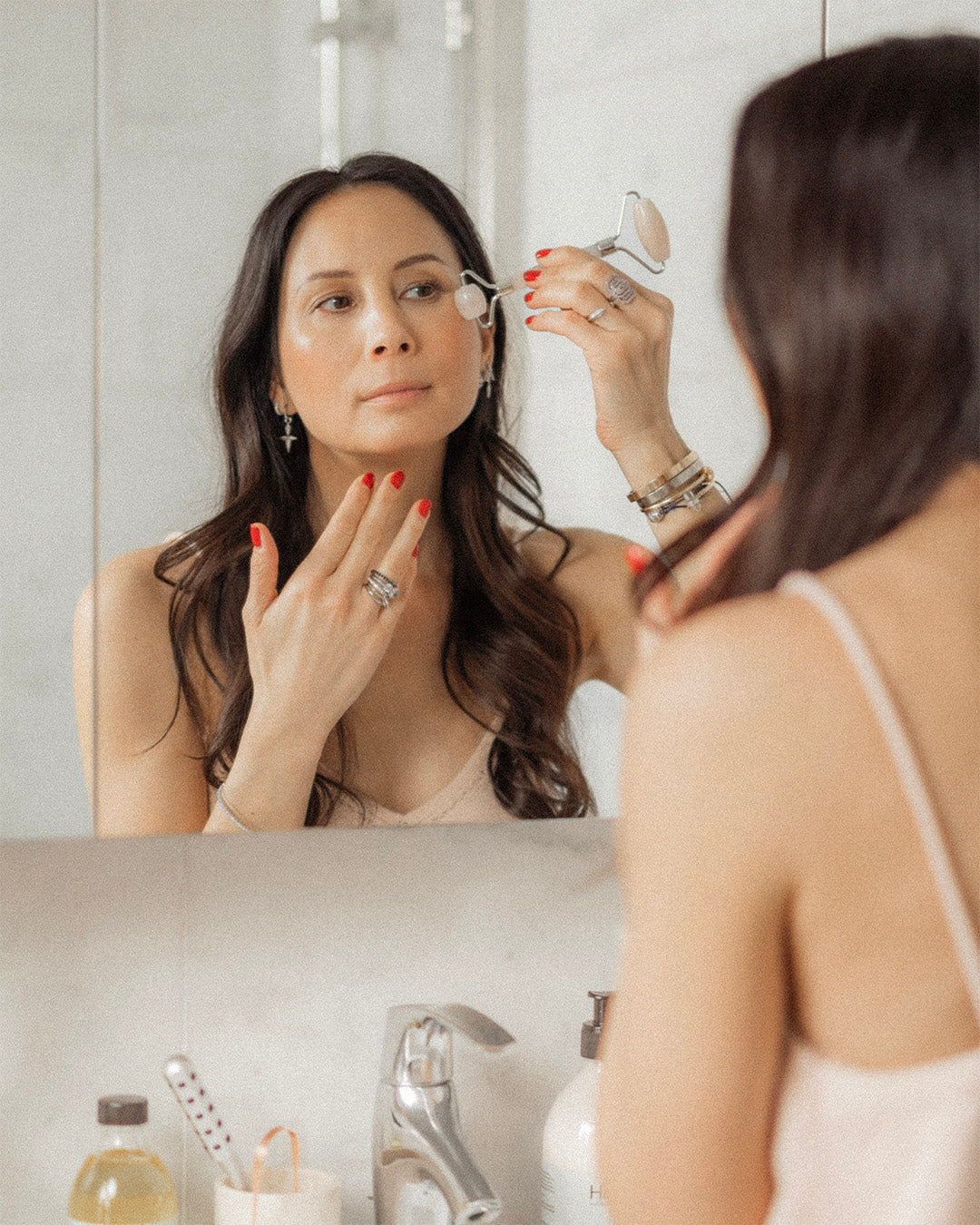Use the Rose Quartz Face DuoRoller to relax the muscles, firm the skin, smooth the signs of aging, and reduce expression lines. The stone cools, relaxes the muscles, and tightens the pores.