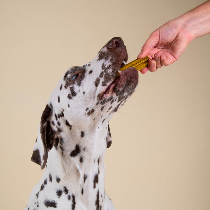 Discover Collagen & Turmeric Dental Sticks, dental treats created in collaboration with Franklin, the animal welfare expert, to offer your dog a 2-in-1 treatment for a healthy, clean mouth while providing anti-inflammatory benefits. Collagen strengthens and regenerates joint structures, while Turmeric reduces your dog's inflammation and pain.